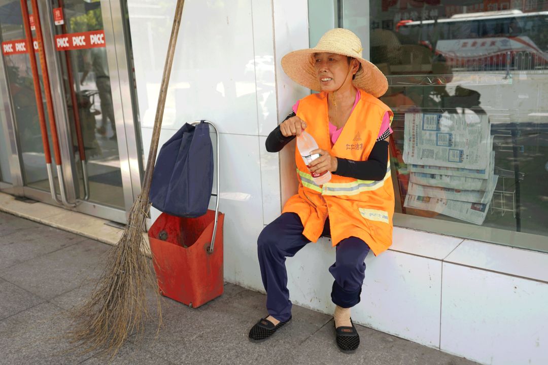 环卫工人陈谷宗坐在保险公司门口短暂休息