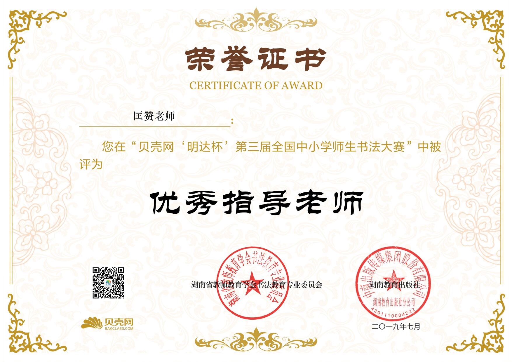 日前,在由湖南省教师教育学会书法教育专业委员会与湖南教育出版社组织的第三届全国中小学师生书法大赛上,建筑装饰系匡赞老师的书法作品获教师组特等奖,由他指导的系部学生谢珊、吴俊同学的书法作品均获得学生组一等奖,杜誉、肖景月、杨培怡同学的书法作品均获得学生组二等奖。匡赞老师获优秀指导老师奖。