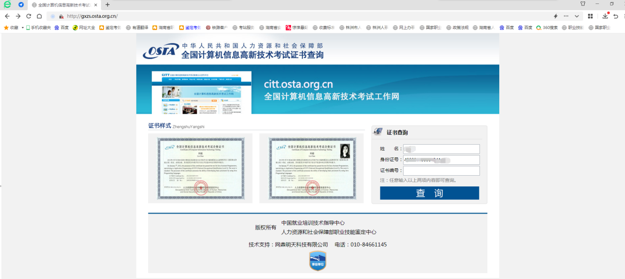 2、输入证书编号、身份证号、姓名(任意两项内容),点击查询即可