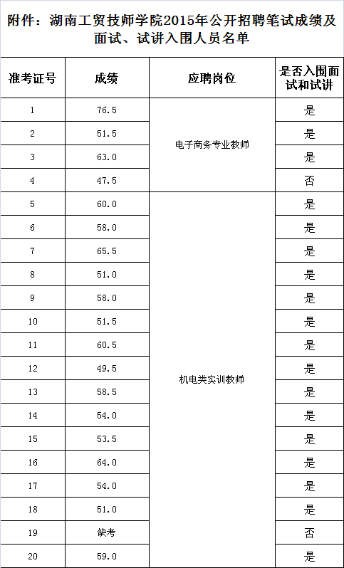根据《万搏体育2015年公开招聘工作人员公告》要求,通过公开报名和资格审查,于2015年12月6日举行了电子商务专业教师岗位和机电类实训教师岗位的笔试考试,阅卷工作已结束。现将笔试成绩及上述两个岗位的面试、试讲入围名单予以公示(见附件),接受社会监督。如有异议,请在公示期(12月9日—12月11日)内实名书面反映,反映人必须用真实姓名,反映情况要实事求是,真实、具体、敢于负责。