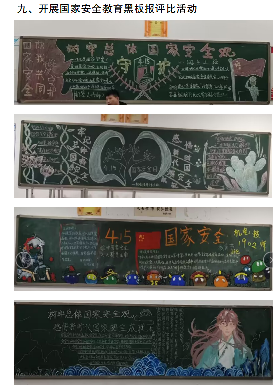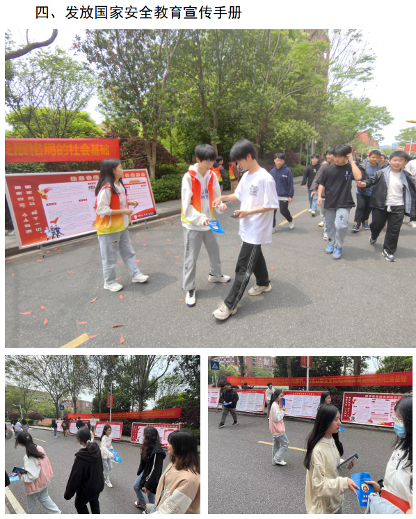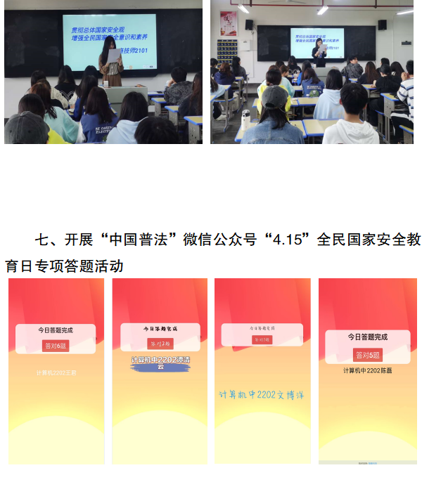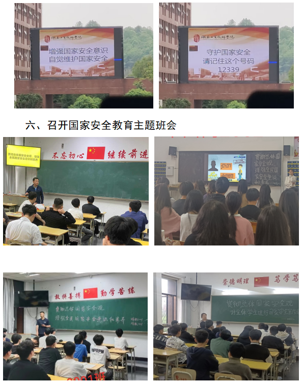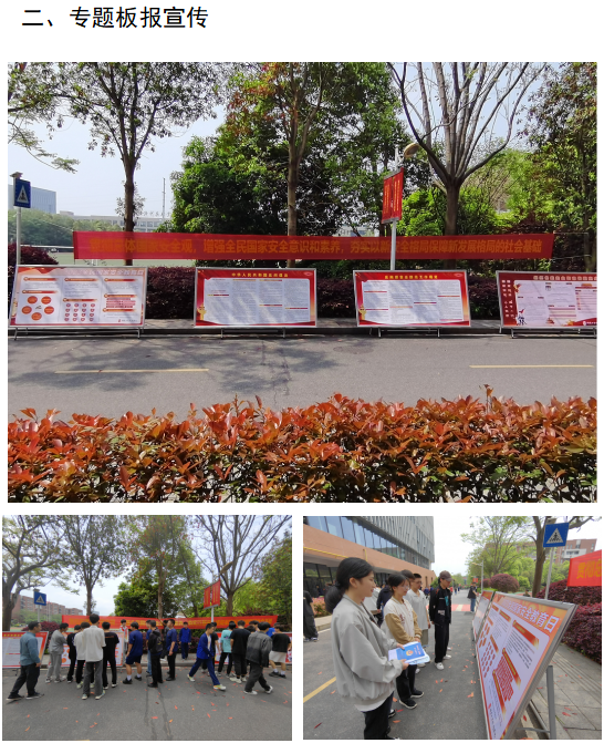 为提高全体学生国家安全意识,根据实施方案的要求开展了专题教育活动。其中:从4月7日开始,连续在万搏体育电子屏滚动播出国家安全宣传标语,在校园广播开设了国家安全教育专栏,在学生保卫处门口、校园食堂、宿舍、教学楼、宣传栏等处摆放了国家安全教育展板或张贴了国家安全宣传海报。4月12日中午,在万搏体育食堂马路组织开展了“贯彻总体国家安全观,增强全民国家安全意识和素养,夯实以新安全格局保障新发展格局的社会基础”签名活动,同时向师生发放了国家安全教育宣传手册。4月12日下午,邀请职教城派出所驻校民警徐闻在阶梯教室开展了国家安全知识讲座。4月12日晚上各班组织召开了“贯彻总体国家安全观,增强全民国家安全意识和素养”主题班会,同时组织全体学生积极参与了“中国普法”微信公众号“4.15”全民国家安全教育日专项答题活动和“反邪教”签名活动。另外,各教学系分别组织开展了国家安全宣传教育黑板报评比活动,并组织学生将国家安全教育情况在微信朋友圈进行分享,扩大了国家安全教育的影响,对提高全社会关注国家安全、主动参与和自觉维护国家安全的意识和能力起到了一定推动作用。