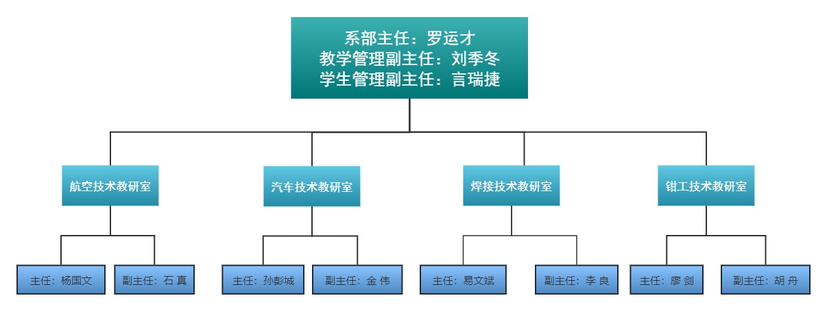 航空工程系整体实力雄厚,拥有一支结构合理、学术氛围浓厚、专业知识丰富、技能水平强、综合素质好的优秀教师队伍。现有教职工38人,其中高级讲师、高级实习指导老师、高级技师14人;讲师、一级实习指导教师、技师17人;全国、湖南省技术能手4人,市级师德师风标兵1人,市级教书育人奖获得者1人,职业教育教师教学创新团队1个,双师比例达90%以上。