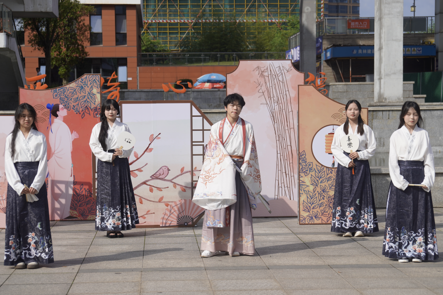 活动现场精彩纷呈,气氛热烈。身穿各式汉服的表演者们手持道具,依次走过广场,展示了汉服之美。他们身姿优雅,动作流畅,吸引了众多师生驻足观看。