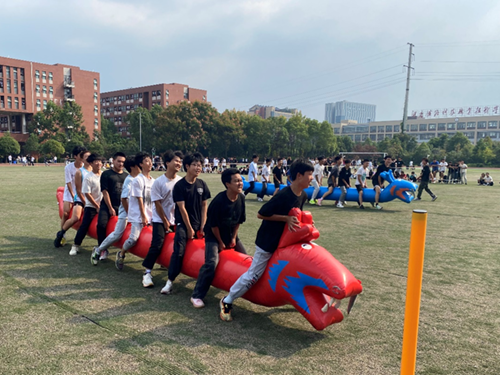 此次趣味运动会共设有4个团体项目和1个单人项目,包括旱地龙舟、袋鼠跳、齐心协力绕杆跑、滚铁环、水杯吹球等,全系700余名新生都积极的参与到比赛当中。同学们热情满满,活力四射,比赛紧张而又有趣,加油声、鼓掌声此起彼伏。