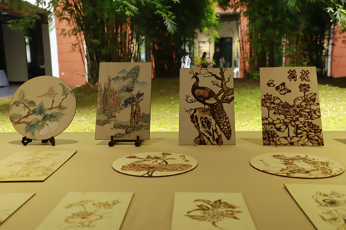 每件展品背后,都藏着一段动人的匠心故事。平面设计专业师生为让非遗烙画“活”起来,从选竹轻叩听声到烙笔温度把控,历经 50 余次试验,才让竹片上的锦鲤鳞片泛起“波光”;环境艺术设计团队为“管道变形记”项目,在废料堆中“淘宝”三个月,切割打磨出的 300 余件管材,最终化作精密枪械模型的“钢铁骨骼”。“这些展品不是冰冷的物件,是我们熬夜改图的凌晨三点,是老师手把手纠正握笔姿势的温度。”环艺技师2102班向利娇、周秋云轻抚着自己参与设计的数字孪生模型感慨道。