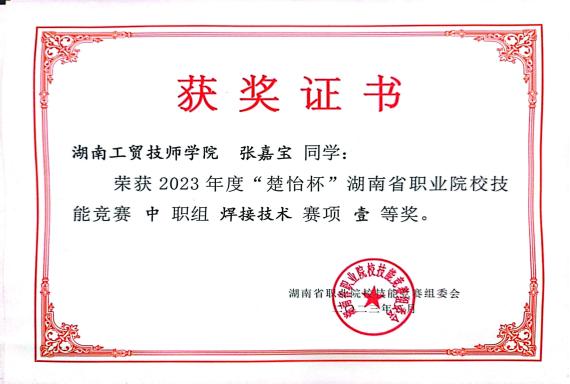 本赛项由湖南省教育厅、湘潭市人民政府主办,来自全省各地的选手同台比武。中职组焊接技术赛项以个人赛方式进行,分三个模块进行,重点考察选手按图纸要求进行试件打磨、装配和焊接的技术能力,同时考核选手的操作规范性和安全文明生产等。张嘉宝和李世杰两位选手凭借扎实的专业知识及高超的技能水平,均荣获该赛项一等奖。