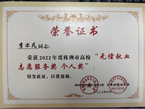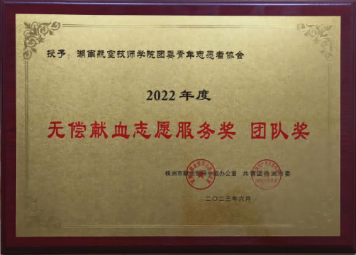 近日,湖南省卫健委、教育厅下发关于2021-2022 年度全省学校无偿献血表现优秀单位和个人的通报,万搏体育荣获湖南省2021-2022 年度组织应急献血优秀单位。根据团株洲市委《关于表彰2022年度株洲市高校无偿献血先进集体和先进个人的决定》(株献办联[2023] 3号)文件,我院团委荣获株洲市2022年高校无偿献血组织奖,我院青年志愿者协会荣获株洲市2022年无偿献血志愿服务团队奖,团委李亦凡老师荣获2022年无偿献血志愿服务个人奖。