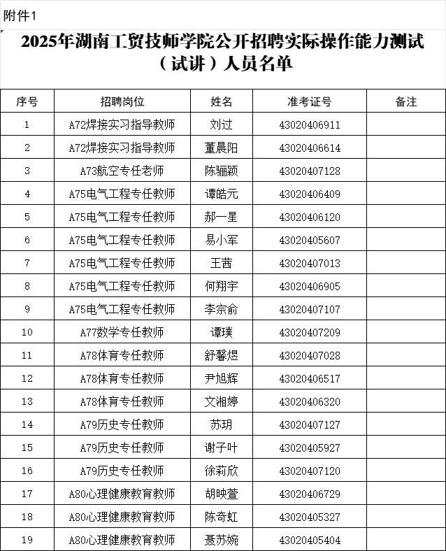 此次公开招聘试讲19人,名单详见附件1。